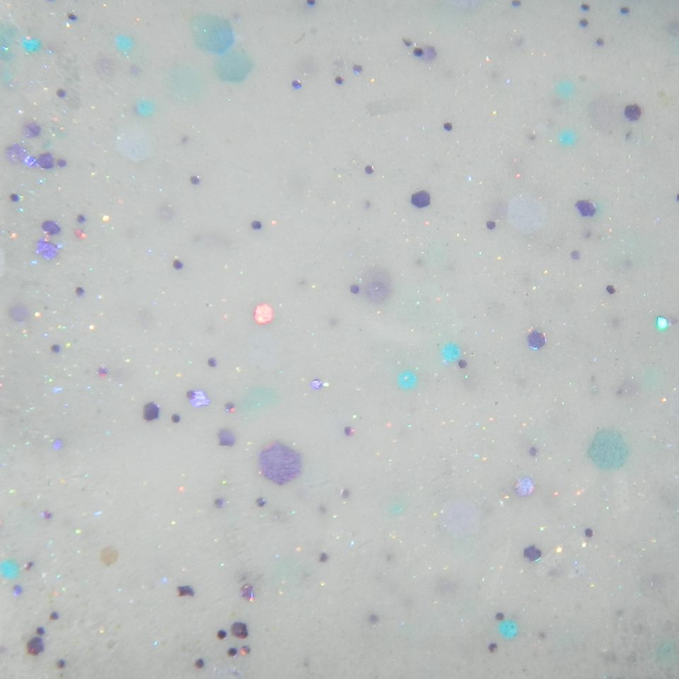 It is a very pale grey, almost white, crelly base with a touch of shimmer. With pastel blue, purple, and white glitters.